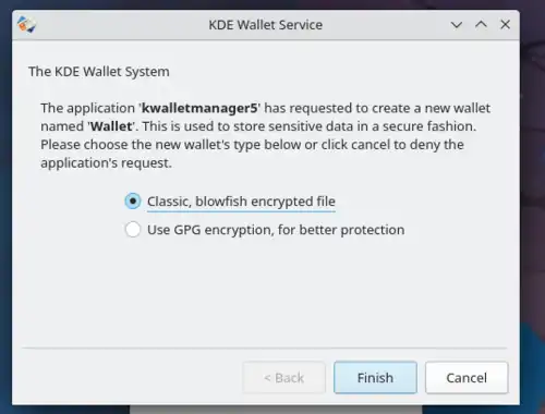 The data stored by the KDE Wallet manager can be encrypted in two major ways. The GNU Privacy Guard (GnuPG or GPG) algorithm is used if GnuPG Made Easy library is installed on the user’s Linux-based OS. If not, Blowfish symmetric block cipher algorithm is used.[6]