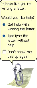 First introduced in Microsoft Office 97,[15] the Office Assistant was code-named TFC during development, with the "C" standing for "clown".[16] It appeared when the program determined the user could be assisted by using Office wizards, searching help, or advising users on using Office features more effectively. It also presented tips and keyboard shortcuts. For example, typing an address followed by "Dear" would cause the Assistant to appear with the message, "It looks like you're writing a letter. Would you like help?"
