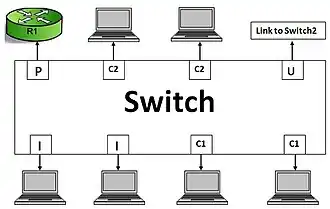 - Promiscuous port (P-Port): The switch port connects to a router, firewall or other common gateway device. This port can communicate with anything else connected to the primary or any secondary VLAN. In other words, it is a type of a port that is allowed to send and receive frames from any other port on the VLAN.