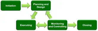 There are five phases to a project lifecycle; known as process groups. Each process group represents a series of inter-related processes to manage the work through a series of distinct steps to be completed. This type of project approach is often referred to as "traditional"[31] or "waterfall".[32] The five process groups are: