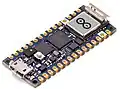 Nano RP2040 Connect[20] | Arduino | 45×18 | 30 | via pads | 5+4+2 | micro-USB | 16 MB | 1 | Wi-Fi, Bluetooth, 9-axis IMU, microphone | ![]() | |||