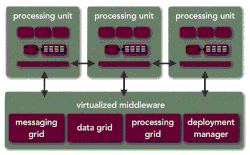 Component Description Messaging grid Handles the flow of incoming transaction as well as the communication between services Data grid Manages the data in distributed memory with options for synchronizing that data with an underlying database Processing grid Parallel processing component based on the master/worker pattern (also known as a blackboard pattern) that enables parallel processing of events among different services