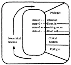 The algorithm is modeled on a waiting room with an entry and exit doorway.[1] Initially the entry door is open and the exit door is closed. All processes which request entry into the critical section at roughly the same time enter the waiting room; the last of them closes the entry door and opens the exit door. The processes then enter the critical section one by one (or in larger groups if the critical section permits this). The last process to leave the critical section closes the exit door and reopens the entry door, so the next batch of processes may enter.