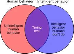 The Turing test, originally called the imitation game by Alan Turing in 1949,[2] is a test of a machine's ability to exhibit intelligent behaviour equivalent to that of a human. In the test, a human evaluator judges a text transcript of a natural-language conversation between a human and a machine. The evaluator tries to identify the machine, and the machine passes if the evaluator cannot reliably tell them apart. The results would not depend on the machine's ability to answer questions correctly, only on how closely its answers resembled those of a human. Since the Turing test is a test of indistinguishability in performance capacity, the verbal version generalizes naturally to all of human performance capacity, verbal as well as nonverbal (robotic).[3]