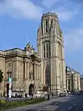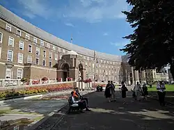 Bristol was heavily damaged by Luftwaffe raids during World War II; about 1,300 people living or working in the city were killed and nearly 100,000 buildings were damaged, at least 3,000 beyond repair.[81][82] The original central shopping area, near the bridge and castle, is now a park containing two bombed churches and fragments of the castle. A third bomb-damaged church nearby, St Nicholas was restored and after a period as a museum has now re-opened as a church.[83] It houses a 1756 William Hogarth triptych painted for the high altar of St Mary Redcliffe. The church also has statues of King Edward I (moved from Arno's Court Triumphal Arch) and King Edward III (taken from Lawfords' Gate in the city walls when they were demolished about 1760), and 13th-century statues of Robert, 1st Earl of Gloucester (builder of Bristol Castle)[84] and Geoffrey de Montbray (who built the city's walls) from Bristol's Newgate.[85]
