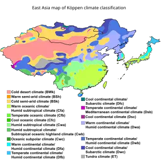 East Asia is home to many climatic zones. It also has unique weather patterns such as the East Asian rainy season and the East Asian Monsoon.[97]