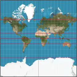 On map projections there is no universal rule as to how meridians and parallels should appear. The examples below show the named parallels (as red lines) on the commonly used Mercator projection and the Transverse Mercator projection. On the former the parallels are horizontal and the meridians are vertical, whereas on the latter there is no exact relationship of parallels and meridians with horizontal and vertical: both are complicated curves.