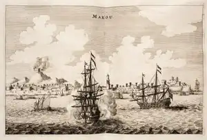 Although the Portuguese were initially prohibited from fortifying Macau or stockpiling weapons, the Fortaleza do Monte was constructed in response to frequent Dutch naval incursions. The Dutch attempted to take the city in the 1622 Battle of Macau, but were repelled successfully by the Portuguese.[36] Macau entered a period of decline in the 1640s following a series of catastrophic events for the burgeoning colony: Portuguese access to trade routes was irreparably severed when Japan halted trade in 1639,[37] and after the Portuguese Restoration War of 1640,[38] Portuguese Malacca fell to the Dutch in 1641.[39][40]