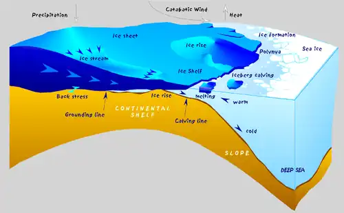 The contribution of these glaciers to global sea levels has already accelerated since the year 2000. The Thwaites Glacier now accounts for 4% of global sea level rise.[115][117][118] It could start to lose even more ice if the Thwaites Ice Shelf fails and would no longer stabilize it, which could potentially occur in mid-2020s.[119] A combination of ice sheet instability with other important but hard-to-model processes like hydrofracturing (meltwater collects atop the ice sheet, pools into fractures and forces them open)[37] or smaller-scale changes in ocean circulation[120][121][122] could cause the WAIS to contribute up to 41 cm (16 in) by 2100 under the low-emission scenario and up to 57 cm (22 in) under the highest-emission one.[4] Ice cliff instability would cause a contribution of 1 m (3+1⁄2 ft) or more if it were applicable.[28][32]
