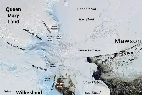 In spite of the net mass gain, some East Antarctica glaciers have lost ice in recent decades due to ocean warming and declining structural support from the local sea ice,[99] such as Denman Glacier,[106][107] and Totten Glacier.[108][109] Totten Glacier is particularly important because it stabilizes the Aurora Subglacial Basin. Subglacial basins like Aurora and Wilkes Basin are major ice reservoirs together holding as much ice as all of West Antarctica.[110] They are more vulnerable than the rest of East Antarctica.[38] Their collective tipping point probably lies at around 3 °C (5.4 °F) of global warming. It may be as high as 6 °C (11 °F) or as low as 2 °C (3.6 °F). Once this tipping point is crossed, the collapse of these subglacial basins could take place over as little as 500 or as much as 10,000 years. The median timeline is 2000 years.[87][88] Depending on how many subglacial basins are vulnerable, this causes sea level rise of between 1.4 m (4 ft 7 in) and 6.4 m (21 ft 0 in).[111]