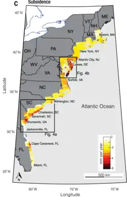 - ^ Ohenhen, Leonard O.; Shirzaei, Manoochehr; Ojha, Chandrakanta; Kirwan, Matthew L. (11 April 2023). "Hidden vulnerability of US Atlantic coast to sea-level rise due to vertical land motion". Nature Communications. 14 (1): 2038. Bibcode:2023NatCo..14.2038O. doi:10.1038/s41467-023-37853-7. PMC 10090057. PMID 37041168.