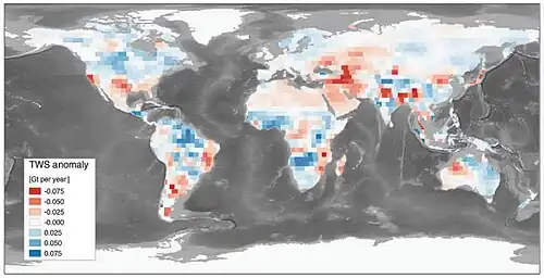 Water redistribution caused by irrigation moving groundwater into the oceans, was estimated at 2,150 GT between 1993 and 2010 - equivalent to a global sea level rise of 6.24 millimetres (0.246 in), but which could not be directly measured. The net movement of water was also expected to cause caused a drift of Earth's rotational pole by 78.48 centimetres (30.90 in), which was confirmed in 2023.[150]