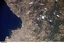 Beirut sits on a peninsula extending westward into the Mediterranean Sea.[90] It is flanked by the Lebanon Mountains and has taken on a triangular shape, largely influenced by its situation between and atop two hills: Al-Ashrafieh and Al-Musaytibah. The Beirut Governorate occupies 18 square kilometres (6.9 sq mi), and the city's metropolitan area 67 square kilometres (26 sq mi).[90] The coast is rather diverse, with rocky beaches, sandy shores and cliffs situated beside one another.
