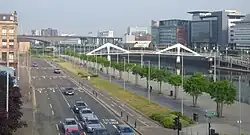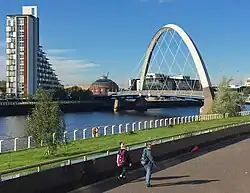 The city invested heavily in roads infrastructure, with an extensive system of arterial roads and motorways that bisected the central area. There are also accusations that the Scottish Office had deliberately attempted to undermine Glasgow's economic and political influence in post-war Scotland by diverting inward investment in new industries to other regions during the Silicon Glen boom and creating the new towns of Cumbernauld, Glenrothes, Irvine, Livingston and East Kilbride, dispersed across the Scottish Lowlands to halve the city's population base.[54] By the late 1980s, there had been a significant resurgence in Glasgow's economic fortunes. The "Glasgow's miles better" campaign, launched in 1983, and opening of the Burrell Collection in 1983 and Scottish Exhibition and Conference Centre in 1985 facilitated Glasgow's new role as a European centre for business services and finance and promoted an increase in tourism and inward investment.[55] The latter continues to be bolstered by the legacy of the city's Glasgow Garden Festival in 1988, its status as European Capital of Culture in 1990,[56] and concerted attempts to diversify the city's economy.[57] However, it is the industrial heritage that serves as key tourism enabler.[58] Wider economic revival has persisted and the ongoing regeneration of inner-city areas, including the large-scale Clyde Waterfront Regeneration, has led to more affluent people moving back to live in the centre of Glasgow, fuelling allegations of gentrification.[59] In 2008, the city was listed by Lonely Planet as one of the world's top 10 tourist cities.[60]