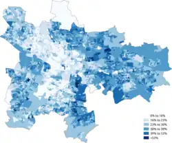 In the 2011 Scottish Parliament election, the boundaries of the Glasgow region were redrawn.[73] In the Scottish independence referendum, Glasgow voted "Yes" by a margin of 53.5% to 46.5%.[74] In the Brexit referendum, results varied from constituency to constituency. Glasgow North recorded the biggest remain vote with 78% opting to stay in the EU whilst in Glasgow East this figure dropped to 56%.[75] The city as a whole voted to remain in the EU, by 66.6% to 33.3%.[76] Following the 2014 Scottish independence referendum, in which 53.49% of the electorate of Glasgow voted in favour of Scottish independence; the SNP won every seat in the city at the 2015 general election, including a record-breaking 39.3% swing from Labour to SNP in the Glasgow North East constituency.[77] At the 2017 snap general election, Glasgow was represented by 6 Scottish National Party MPs and 1 Labour MP; the Glasgow North East constituency which had a record 39.3% swing from Labour to SNP at the previous general election, was regained by Paul Sweeney of the Scottish Labour Party, who narrowly defeated sitting SNP MP Anne McLaughlin by 242 votes.[78][79]