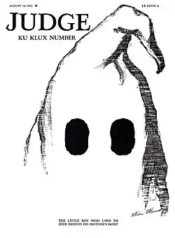 The Second Klan saw threats from every direction. According to historian Brian R. Farmer, "two-thirds of the national Klan lecturers were Protestant ministers".[102] Much of the Klan's energy went into guarding the home, and historian Kathleen Blee says that its members wanted to protect "the interests of white womanhood".[103] Joseph Simmons published the pamphlet ABC of the Invisible Empire in Atlanta in 1917; in it, he identified the Klan's goals as "to shield the sanctity of the home and the chastity of womanhood; to maintain white supremacy; to teach and faithfully inculcate a high spiritual philosophy through an exalted ritualism; and by a practical devotedness to conserve, protect and maintain the distinctive institutions, rights, privileges, principles and ideals of a pure Americanism".[104] Such moral-sounding purpose underlay its appeal as a fraternal organization, recruiting members with a promise of aid for settling into the new urban societies of rapidly growing cities such as Dallas and Detroit.[105] During the 1930s, particularly after James A. Colescott of Indiana took over as imperial wizard, opposition to Communism became another primary aim of the Klan.[17]