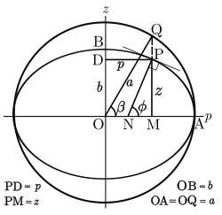 The parametric latitude or reduced latitude, β, is defined by the radius drawn from the centre of the ellipsoid to that point Q on the surrounding sphere (of radius a) which is the projection parallel to the Earth's axis of a point P on the ellipsoid at latitude ϕ. It was introduced by Legendre[11] and Bessel[12] who solved problems for geodesics on the ellipsoid by transforming them to an equivalent problem for spherical geodesics by using this smaller latitude. Bessel's notation, u(ϕ), is also used in the current literature. The parametric latitude is related to the geodetic latitude by:[6][7]