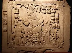 A sajal was ranked below the ajaw, and indicated a subservient lord. A sajal would be lord of a second- or third-tier site, answering to an ajaw, who may himself have been subservient to a kalomte.[125] A sajal would often be a war captain or regional governor, and inscriptions often link the sajal title to warfare; they are often mentioned as the holders of war captives.[130] Sajal meant "feared one".[131] The titles of ah tzʼihb and ah chʼul hun are both related to scribes. The ah tzʼihb was a royal scribe, usually a member of the royal family; the ah chʼul hun was the Keeper of the Holy Books, a title that is closely associated with the ajaw title, indicating that an ajaw always held the ah chʼul hun title simultaneously.[132] Other courtly titles, the functions of which are not well understood, were yajaw kʼahk' ("Lord of Fire"), tiʼhuun and ti'sakhuun. These last two may be variations on the same title,[133] and Mark Zender has suggested that the holder of this title may have been the spokesman for the ruler.[134] Courtly titles are overwhelmingly male-oriented, and in those relatively rare occasions where they are applied to a woman, they appear to be used as honorifics for female royalty.[135] Titled elites were often associated with particular structures in the hieroglyphic inscriptions of Classic period cities, indicating that such office holders either owned that structure, or that the structure was an important focus for their activities.[136] A lakam, or standard-bearer, was possibly the only non-elite post-holder in the royal court.[122] The lakam was only found in larger sites, and they appear to have been responsible for the taxation of local districts.[122]