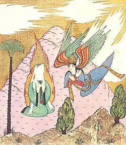 Shortly after Waraqa's death, the revelations ceased for a period, causing Muhammad great distress and thoughts of suicide.[89] On one occasion, he reportedly climbed a mountain intending to jump off. However, upon reaching the peak, Gabriel appeared to him, affirming his status as the true Messenger of God. This encounter soothed Muhammad, and he returned home. Later, when there was another long break between revelations, he repeated this action, but Gabriel intervened similarly, calming him and causing him to return home.[90][91]