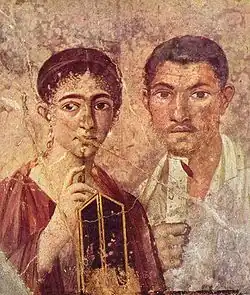 Freeborn Roman women were considered citizens, but did not vote, hold political office, or serve in the military. A mother's citizen status determined that of her children, as indicated by the phrase ex duobus civibus Romanis natos ("children born of two Roman citizens").[j] A Roman woman kept her own family name (nomen) for life. Children most often took the father's name, with some exceptions.[118] Women could own property, enter contracts, and engage in business.[119] Inscriptions throughout the Empire honour women as benefactors in funding public works, an indication they could hold considerable fortunes.[120]