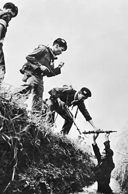 The North Vietnamese Communist Party approved a "people's war" on the South in January 1959,[25]: 119–120 and, in May, Group 559 was established to upgrade the Ho Chi Minh trail, then a six-month mountain trek through Laos. On 28 July, North Vietnamese and Pathet Lao forces invaded Laos, fighting the Royal Lao Army along the border.[139]: 26 About 500 of the "regroupees" of 1954 were sent south on the trail during its first year of operation.[140] The first arms delivery was completed in August 1959.[141] In April 1960, North Vietnam imposed military conscription for men. About 40,000 communist soldiers infiltrated the south between 1961 and 1963.[104]: 76