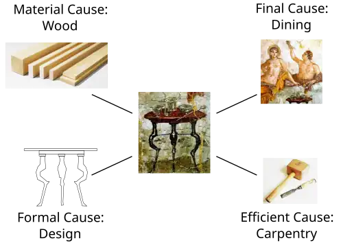 - The formal cause is its form, i.e., the arrangement of that matter, the design of the table independent of the specific material it is made of.[71]