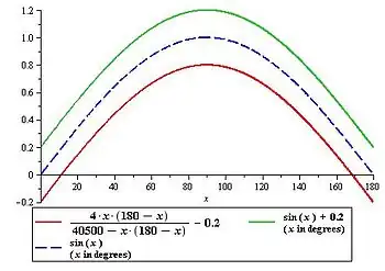 The part of the graph of sin x in the range from 0° to 180° "looks like" part of a parabola through the points (0, 0) and (180, 0). The general form of such a parabola is