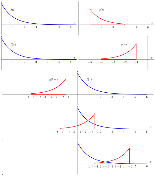 In this depiction, could represent the response of a resistor-capacitor circuit to a narrow pulse that occurs at In other words, if the result of convolution is just But when is the wider pulse (in red), the response is a "smeared" version of It begins at because we defined as the distance from the axis to the center of the wide pulse (instead of the leading edge). | ![]() |