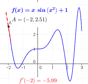 The ratio in the definition of the derivative is the slope of the line through two points on the graph of the function , specifically the points and . As is made smaller, these points grow closer together, and the slope of this line approaches the limiting value, the slope of the tangent to the graph of at . In other words, the derivative is the slope of the tangent.[7]