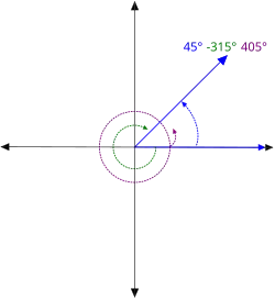 In an oriented Euclidean plane, one can define the oriented angle of two vectors. The oriented angle of two vectors x and y is then the opposite of the oriented angle of y and x. In this case, the angle of two vectors can have any value modulo an integer multiple of 2π. In particular, a reflex angle π < θ < 2π equals the negative angle −π < θ − 2π < 0.