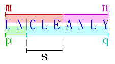 A free monoid is equidivisible: if the equation mn = pq holds, then there exists an s such that either m = ps, sn = q (example see image) or ms = p, n = sq.[9] This result is also known as Levi's lemma.[10]