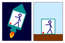 Conversely, one might expect that inertial motions, once identified by observing the actual motions of bodies and making allowances for the external forces (such as electromagnetism or friction), can be used to define the geometry of space, as well as a time coordinate. However, there is an ambiguity once gravity comes into play. According to Newton's law of gravity, and independently verified by experiments such as that of Eötvös and its successors (see Eötvös experiment), there is a universality of free fall (also known as the weak equivalence principle, or the universal equality of inertial and passive-gravitational mass): the trajectory of a test body in free fall depends only on its position and initial speed, but not on any of its material properties.[28] A simplified version of this is embodied in Einstein's elevator experiment, illustrated in the figure on the right: for an observer in an enclosed room, it is impossible to decide, by mapping the trajectory of bodies such as a dropped ball, whether the room is stationary in a gravitational field and the ball accelerating, or in free space aboard a rocket that is accelerating at a rate equal to that of the gravitational field versus the ball which upon release has nil acceleration.[29]