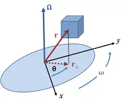 A special case of a particle trajectory on a circular cylinder occurs when there is no movement along the z axis: where r and z0 are constants. In this case, the velocity vP is given by: where is the angular velocity of the unit vector θ^ around the z axis of the cylinder.