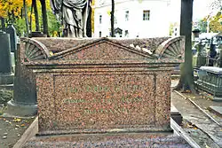 Euler was buried next to Katharina at the Smolensk Lutheran Cemetery on Vasilievsky Island. In 1837, the Russian Academy of Sciences installed a new monument, replacing his overgrown grave plaque. In 1957, to commemorate the 250th anniversary of his birth, his tomb was moved to the Lazarevskoe Cemetery at the Alexander Nevsky Monastery.[67]
