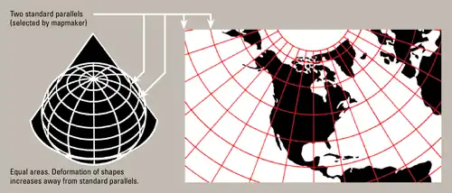 - Albers conic, which adjusts the north-south distance between non-standard parallels to compensate for the east-west stretching or compression, giving an equal-area map.