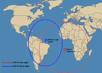 Celestial navigation systems are based on observation of the positions of the Sun, Moon, planets and navigational stars using a sextant or similar navigation instrument.[58] By knowing which point on the rotating Earth a celestial object is above and measuring its height above the observer's horizon, the navigator can determine his distance from that subpoint using mathematical calculation.[59] A nautical almanac and a source of time, typically a marine chronometer are used to compute the subpoint on Earth a celestial body is over, and a sextant is used to measure the body's angular height above the horizon.[59] That height can then be used to compute distance from the subpoint to create a circular line of position. Alternatively sight reduction tables can be used.[60] A navigator shoots a number of stars in succession to give a series of overlapping lines of position. Where they intersect is the celestial fix. The Moon and Sun may also be used. The Sun can also be used by itself to shoot a succession of lines of position (best done around local noon) to determine a position.[61] Since the advent of GNSS, celestial navigation is less used for marine and air navigation, though it remains useful as a backup or as another method to cross-check the accuracy of electronic systems, particularly in the open ocean.[62][63]