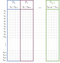 The adjacency matrix distributed between multiple processors for parallel Prim's algorithm. In each iteration of the algorithm, every processor updates its part of C by inspecting the row of the newly inserted vertex in its set of columns in the adjacency matrix. The results are then collected and the next vertex to include in the MST is selected globally.