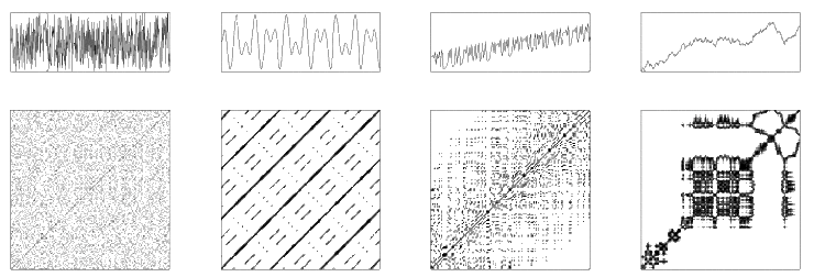 Typical examples of recurrence plots (top row: time series (plotted over time); bottom row: corresponding recurrence plots). From left to right: uncorrelated stochastic data (white noise), harmonic oscillation with two frequencies, chaotic data (logistic map) with linear trend, and data from an auto-regressive process.