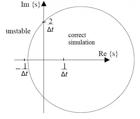 The stability region of the semi-implicit method was presented by Niiranen[4] although the semi-implicit Euler was misleadingly called symmetric Euler in his paper. The semi-implicit method models the simulated system correctly if the complex roots of the characteristic equation are within the circle shown below. For real roots the stability region extends outside the circle for which the criterion is