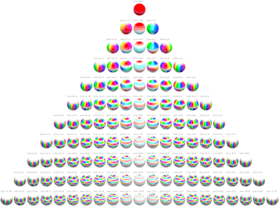 Below the complex spherical harmonics are represented on polar plots. The magnitude of the spherical harmonic at particular polar and azimuthal angles is represented by the saturation of the color at that point and the phase is represented by the hue at that point.