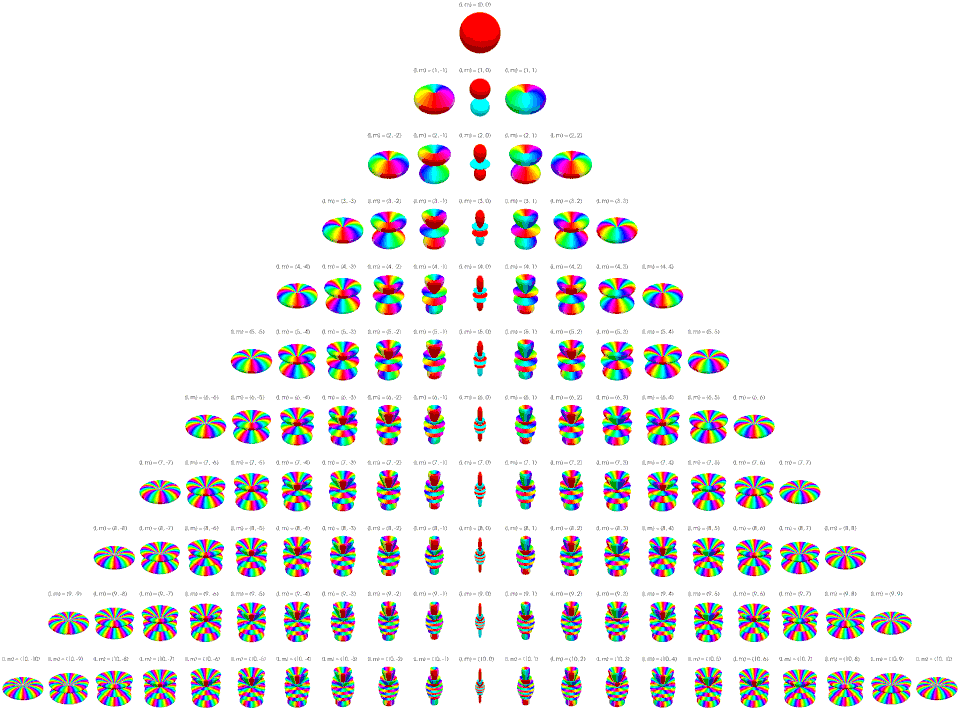 Below the complex spherical harmonics are represented on polar plots. The magnitude of the spherical harmonic at particular polar and azimuthal angles is represented by the radius of the plot at that point and the phase is represented by the hue at that point.