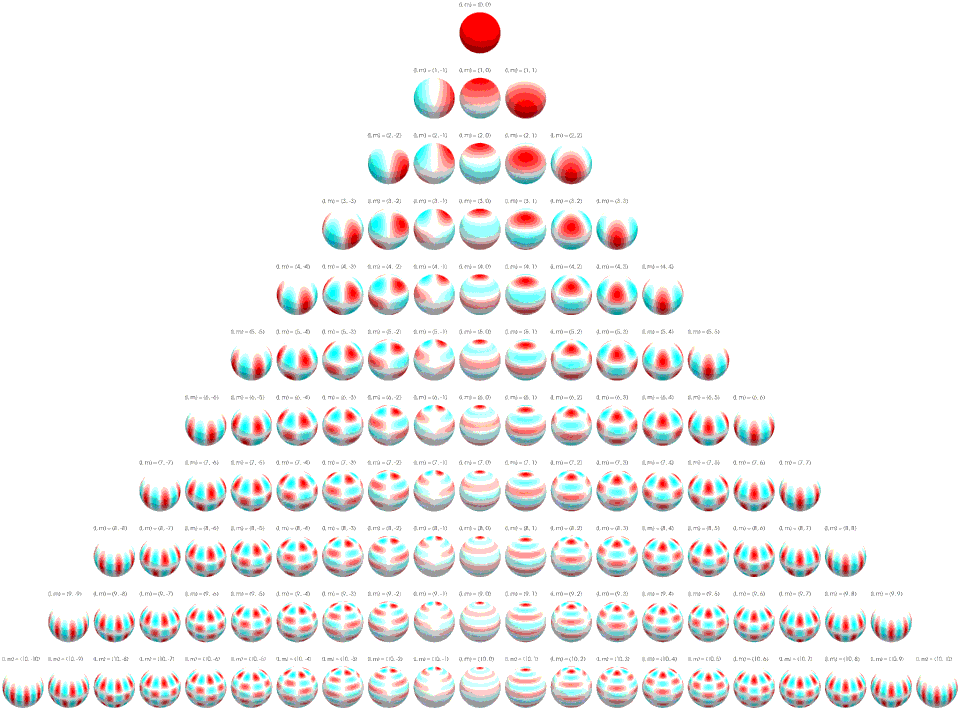 , on the vertical axis. The saturation of the color at any point represents the magnitude of the spherical harmonic. Positive values are red and negative values are teal.