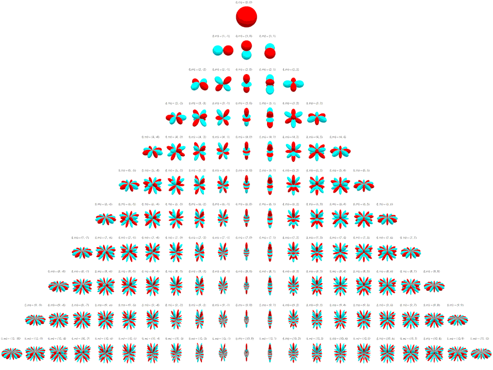 Below the real spherical harmonics are represented on polar plots. The magnitude of the spherical harmonic at particular polar and azimuthal angles is represented by the radius of the plot at that point and the phase is represented by the hue at that point.