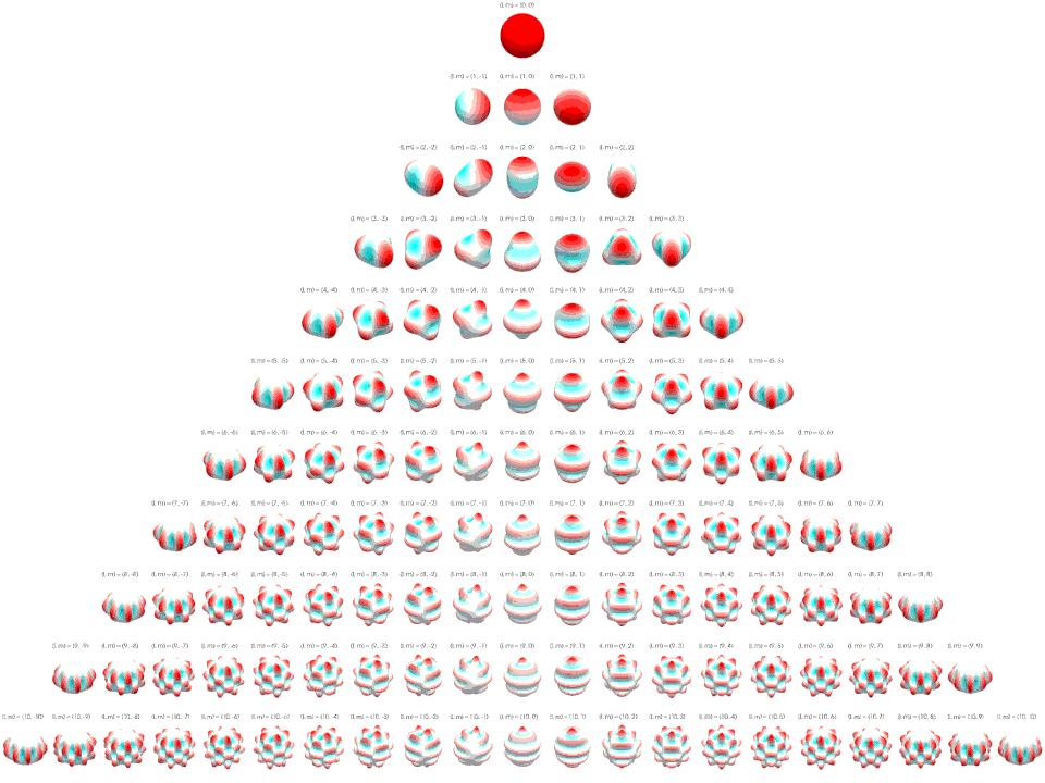 Visual Array of Real Spherical Harmonics Represented with Polar Plot with Amplitude Mapped to Elevation and Saturation