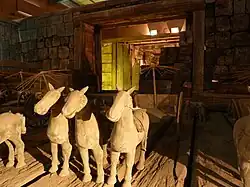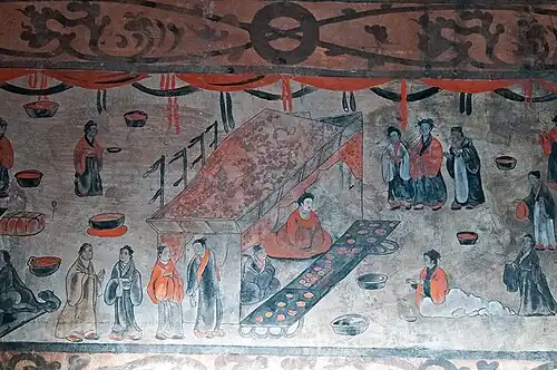 Ancient Chinese texts describe the mechanical carriage's functions; after one li was traversed, a mechanically driven wooden figure struck a drum, and after ten li had been covered, another wooden figure struck a gong or a bell with its mechanically operated arm.[117] However, there is evidence to suggest that the invention of the odometer was a gradual process in Han dynasty China that centered on the "huang men"—court people (i.e. eunuchs, palace officials, attendants and familiars, actors, acrobats, etc.) who followed the musical procession of the royal "drum-chariot".[119] There is speculation that at some time during the 1st century BC the beating of drums and gongs was mechanically driven by the rotation of the road wheels.[119] This might have actually been the design of Luoxia Hong (c. 110 BC), yet by at least 125 the mechanical odometer carriage was already known, as it was depicted in a mural of the Xiao Tang Shan Tomb.[119]