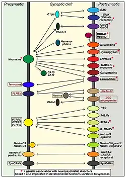 - ^ a b c d Dean C, Dresbach T (January 2006). "Neuroligins and neurexins: linking cell adhesion, synapse formation and cognitive function". Trends in Neurosciences. 29 (1): 21–29. doi:10.1016/j.tins.2005.11.003. PMID 16337696. S2CID 11664697.