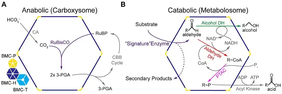 In addition to the anabolic carboxysomes, several catabolic BMCs have been characterized that participate in the heterotrophic metabolism via short-chain aldehydes; they are collectively termed metabolosomes.[5][22][11]