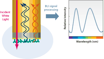 Bio-layer interferometry (BLI) is an optical biosensing technology that analyzes biomolecular interactions in real-time without the need for fluorescent labeling.[1] Alongside surface plasmon resonance (SPR), BLI is one of few widely available label-free biosensing technologies, a detection style that yields more information in less time than traditional processes.[2] The technology relies on the phase shift-wavelength correlation created between interference patterns off of two unique surfaces on the tip of a biosensor.[3] BLI has significant applications in quantifying binding strength, measuring protein interactions, and identifying properties of reaction kinetics, such as rate constants and reaction rates.[4]
