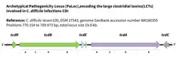 - ^ Braun V, Hundsberger T, Leukel P, Sauerborn M, von Eichel-Streiber C (November 1996). "Definition of the single integration site of the pathogenicity locus in Clostridium difficile". Gene. 181 (1–2): 29–38. doi:10.1016/S0378-1119(96)00398-8. PMID 8973304.