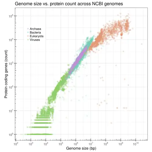 Log–log plot of the total number of annotated proteins in genomes submitted to GenBank as a function of genome size